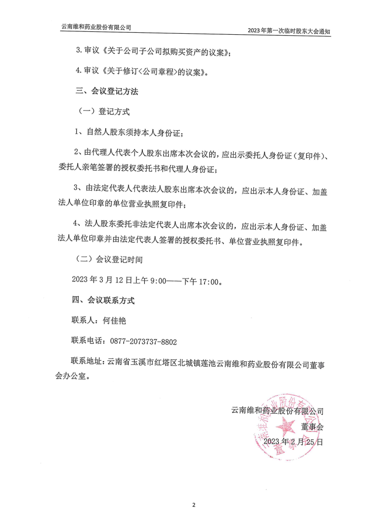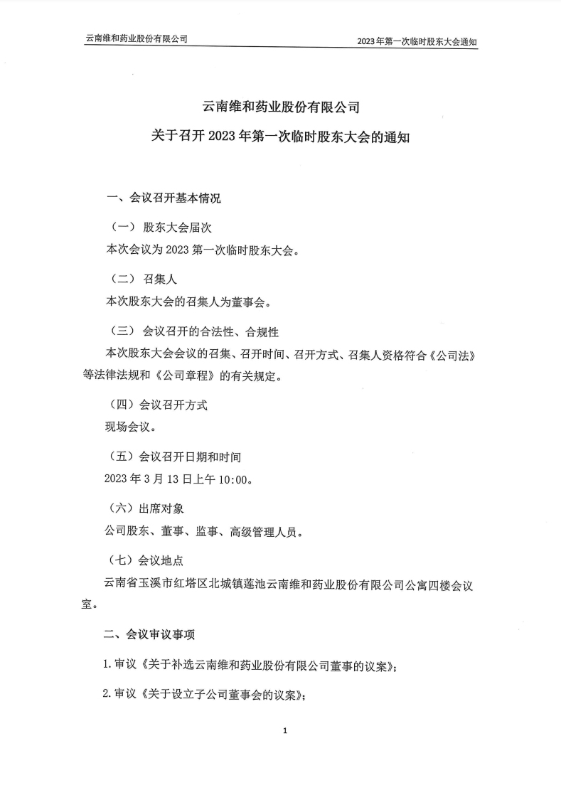 云南維和藥業(yè)股份有限公司關于召開2023年第一次臨時股東大會的通知