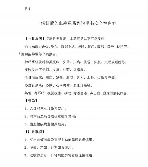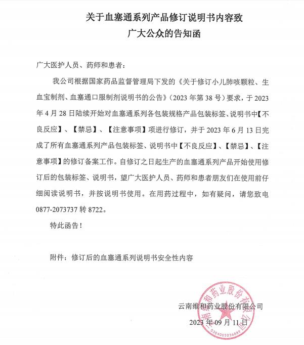 關(guān)于血塞通系列產(chǎn)品修訂說(shuō)明書(shū)內(nèi)容致廣大公眾的告知函